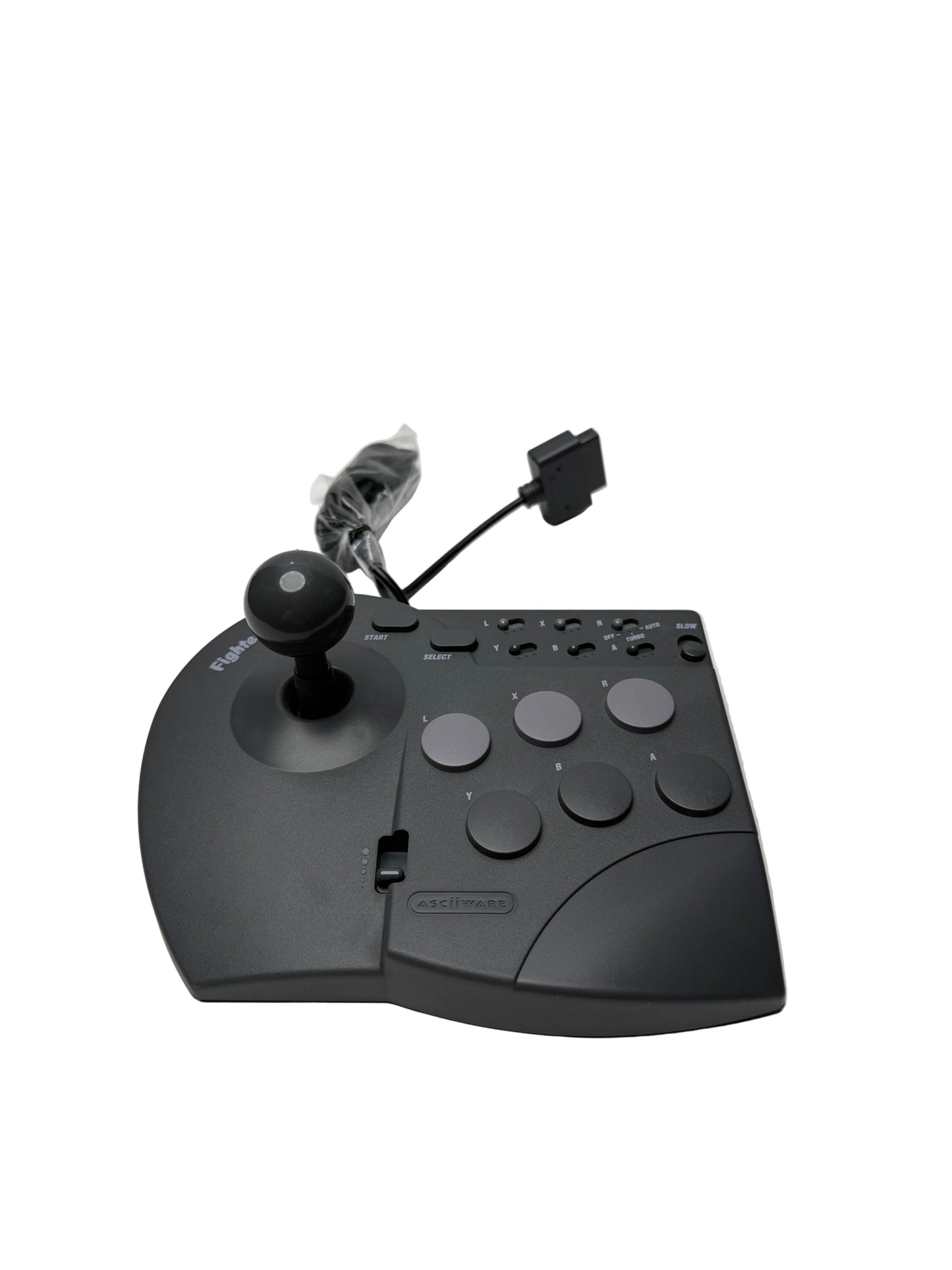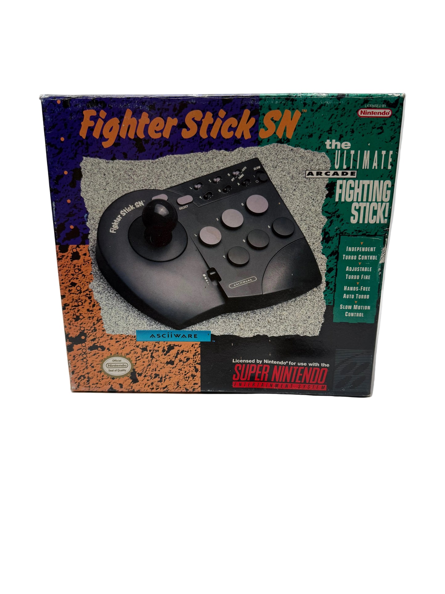Asciiware Fighter Stick SN for Super Nintendo. Complete in original box. Arcade-style fight stick with 6-button layout designed for fighting games.